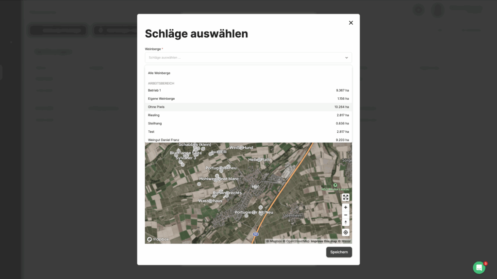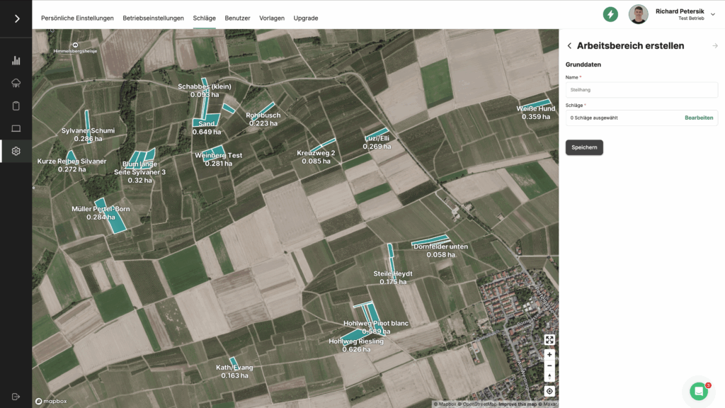 Um einen Arbeitsbereich zu erstellen navigiere Dich zunächst zu Einstellungen –> Schläge. Hier kannst Du in der Seitenleiste rechts auf „Arbeitsbereiche“ wechseln. Wähle nun auf der Karte oben rechts den Button „Arbeitsbereich hinzufügen„. Klicke auf den Reiter „Schläge“ in der Seitenleiste, um dem Arbeitsbereich Schläge zuzuordnen (bspw. gegliedert nach bestimmten Rebsorten, Regionen, BEWs für Düngung, Jungfelder, Piwis etc.).
