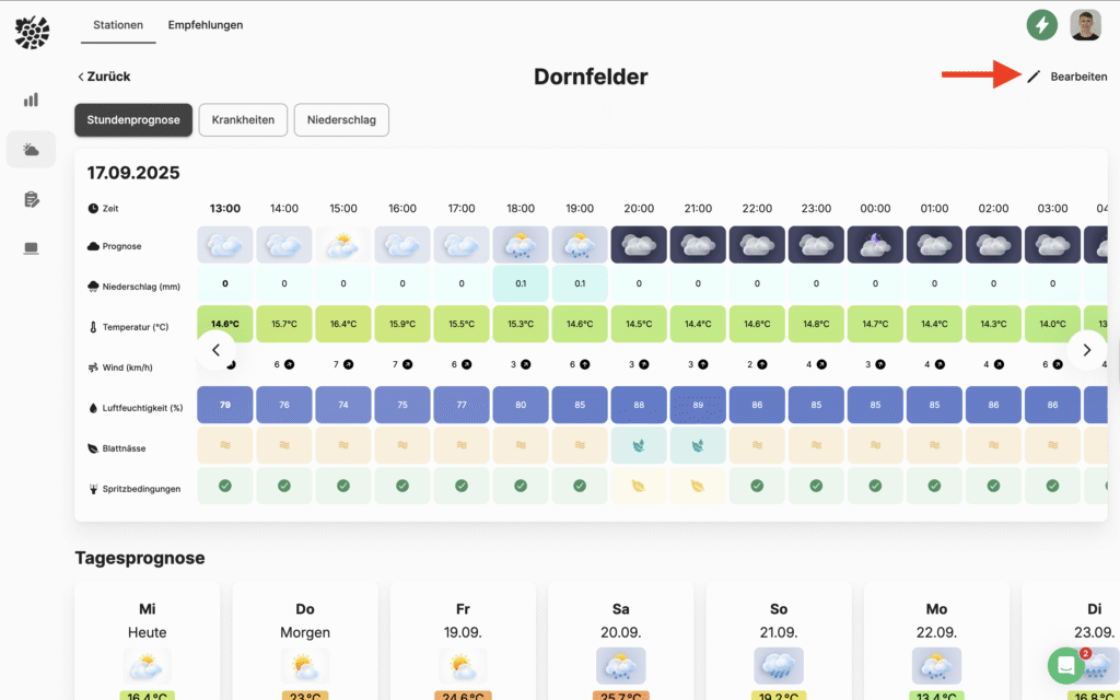 Wenn du eine bereits angelegte virtuelle Wetterstation nochmal bearbeiten möchtest, um beispielsweise den Standort zu verändern, kannst du dies ganz einfach tun. Wähle unter Prognosen -> Stationen die gewünschte Station aus. Oben rechts kannst du über den Button bearbeiten Änderungen an der Station vornehmen.